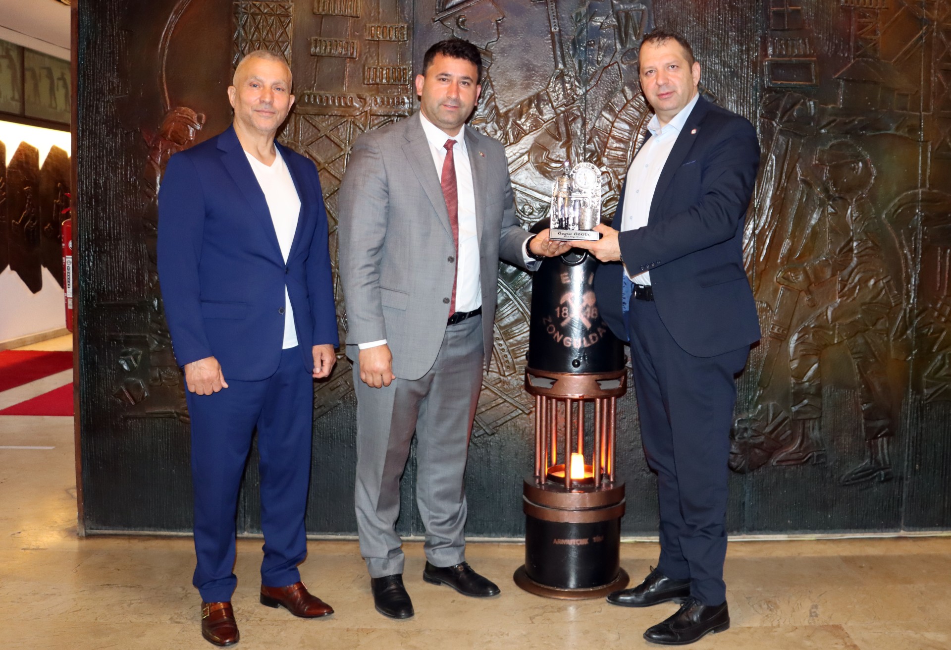 GMİS Genel Sekreteri Yener Arslanbuğa, MTA Kuzeybatı Anadolu Bölge Müdürü Özgür Özgüç’e ziyaretin anısı olarak madenci heykeli takdim etti